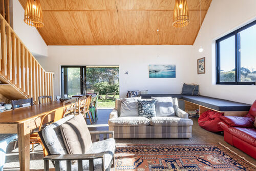 The Black Barn comfortably sleeps eight guests across three bedrooms, with a fun bunk room offering three sets of bunks (two of them child-sized), creating flexibility for families of up to ten guests. An open-plan living area flows out onto a sun-drenched deck and expansive lawn, ideal for BBQs, backyard games, or simply soaking up the quiet coastal atmosphere.
