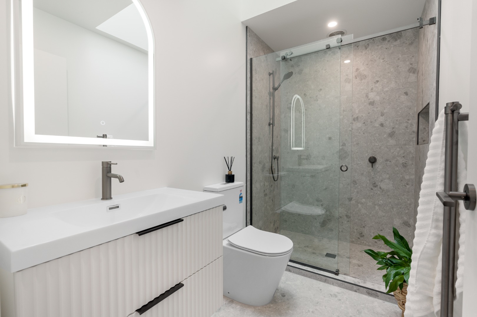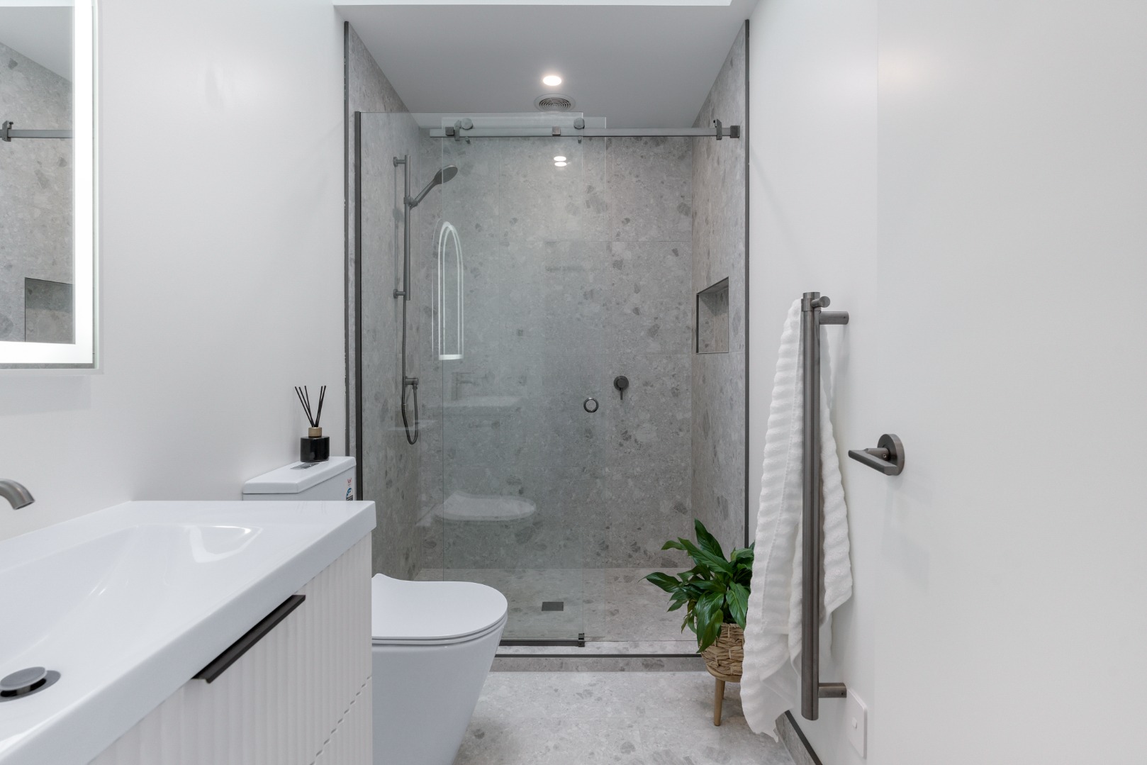 A beautifully finished bathroom with luxurious underfloor heating, a large shower, and a skylight