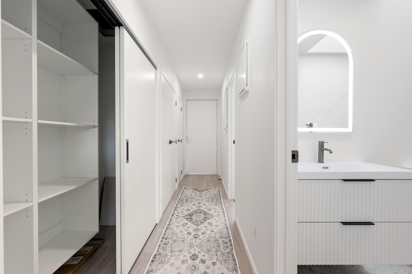 A generous queen-size bedroom with built-in wardrobes and shelving