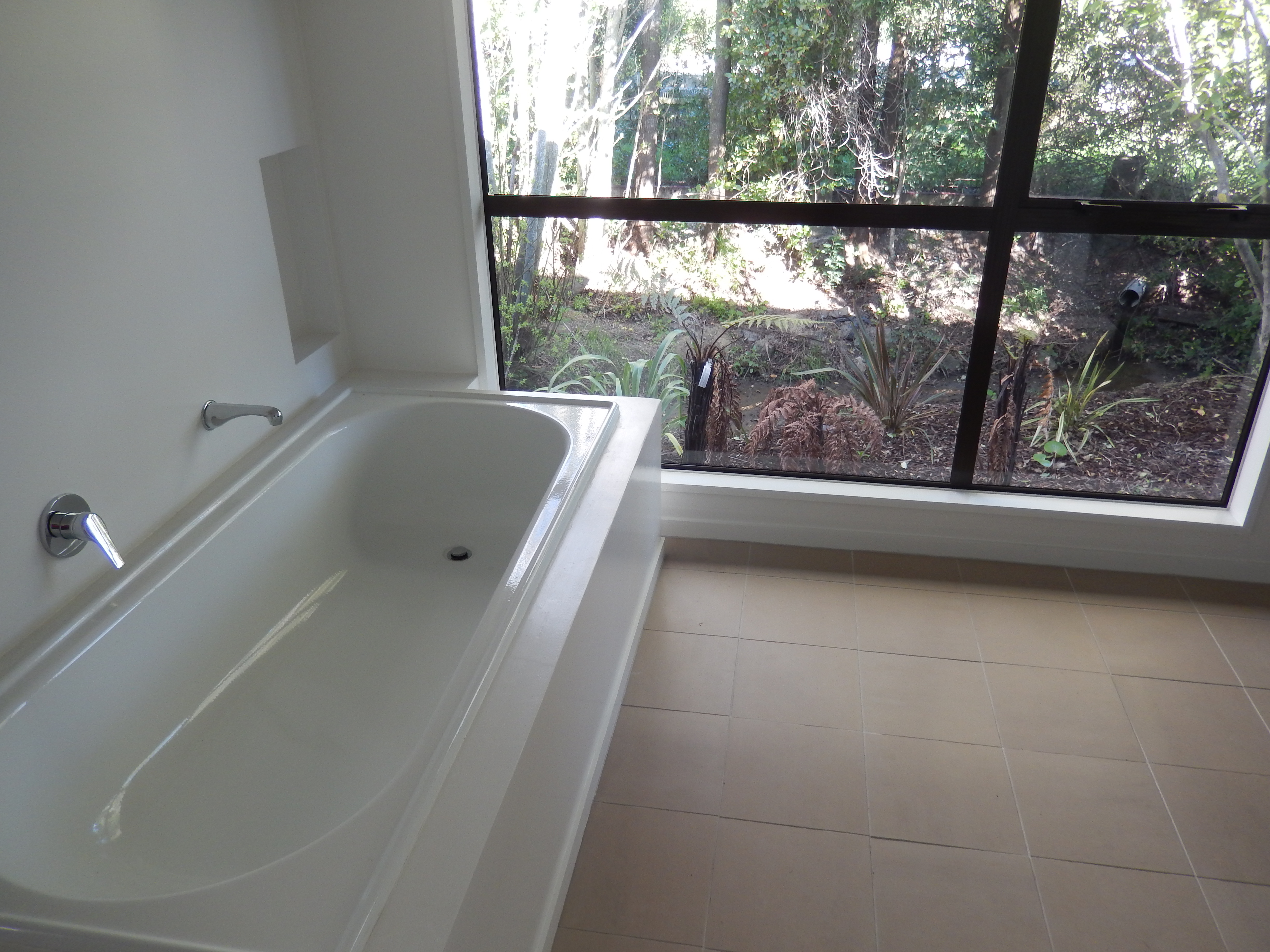 The stunning tiled family bathroom features a double vanity, bath, separate shower, and a window overlooking the private garden. A separate toilet and a dedicated laundry with a new hot water cylinder add everyday practicality.
