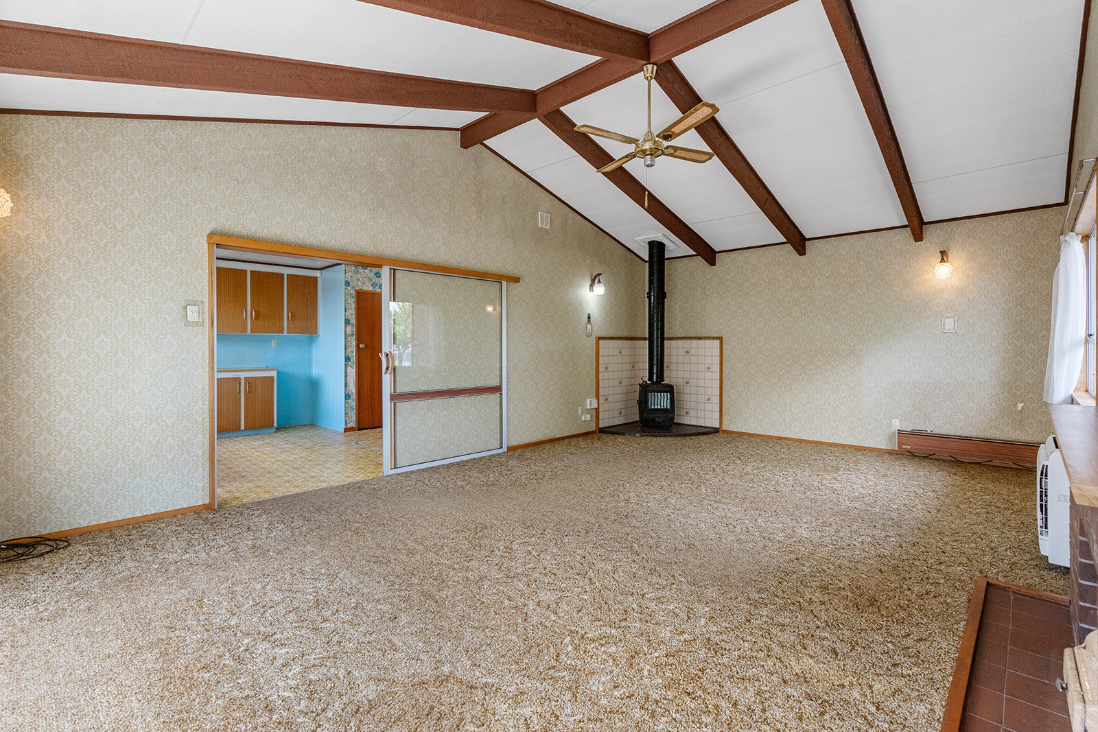 The generous sized kitchen and dining area flows into the lounge, heated by a heatpump and wood fire, which creates a welcoming space for everyday living.