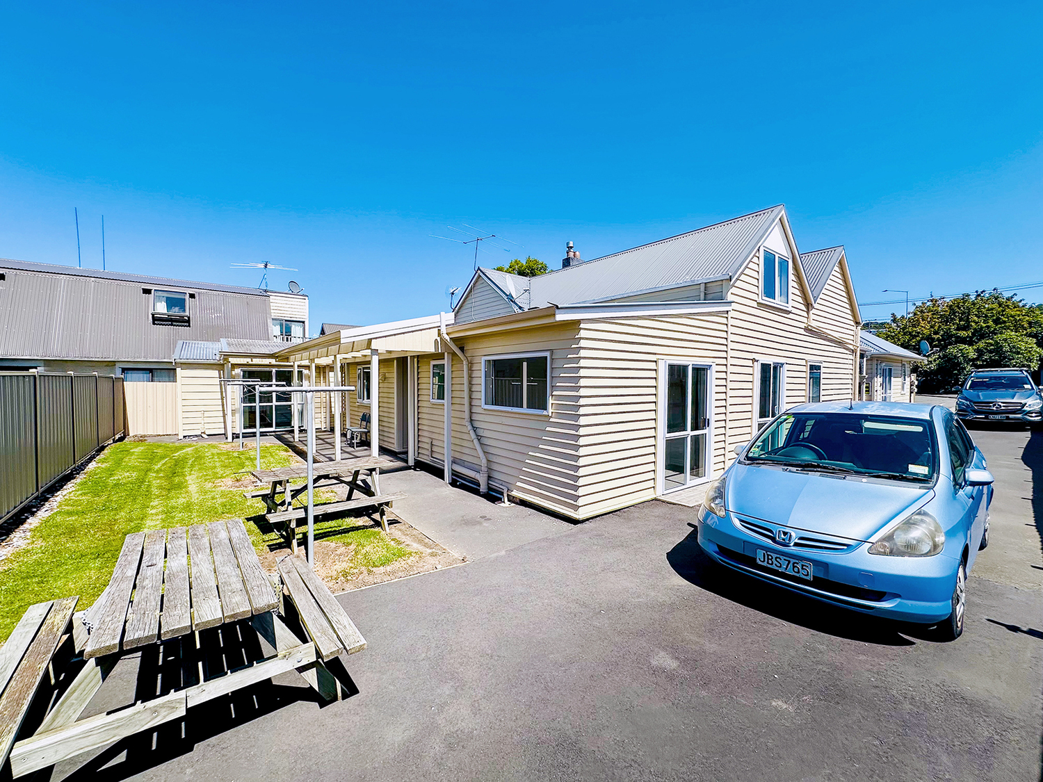 Verandah at the front of house plus private, sunny, sheltered rear yard with another verandah and BBQ table. Clothesline gets great sun.