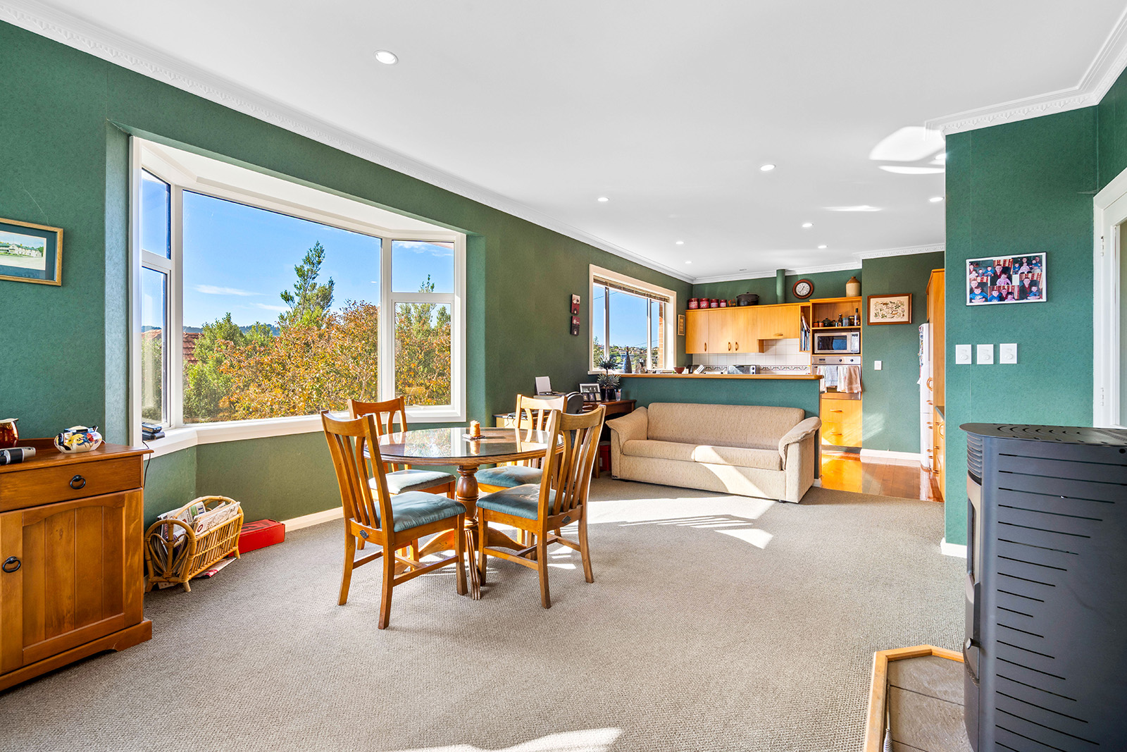 The heart of the home is the light-filled open plan living area, designed for both relaxation and entertaining. A pellet fire creates a warm and inviting atmosphere, making it a cosy retreat through the cooler months.