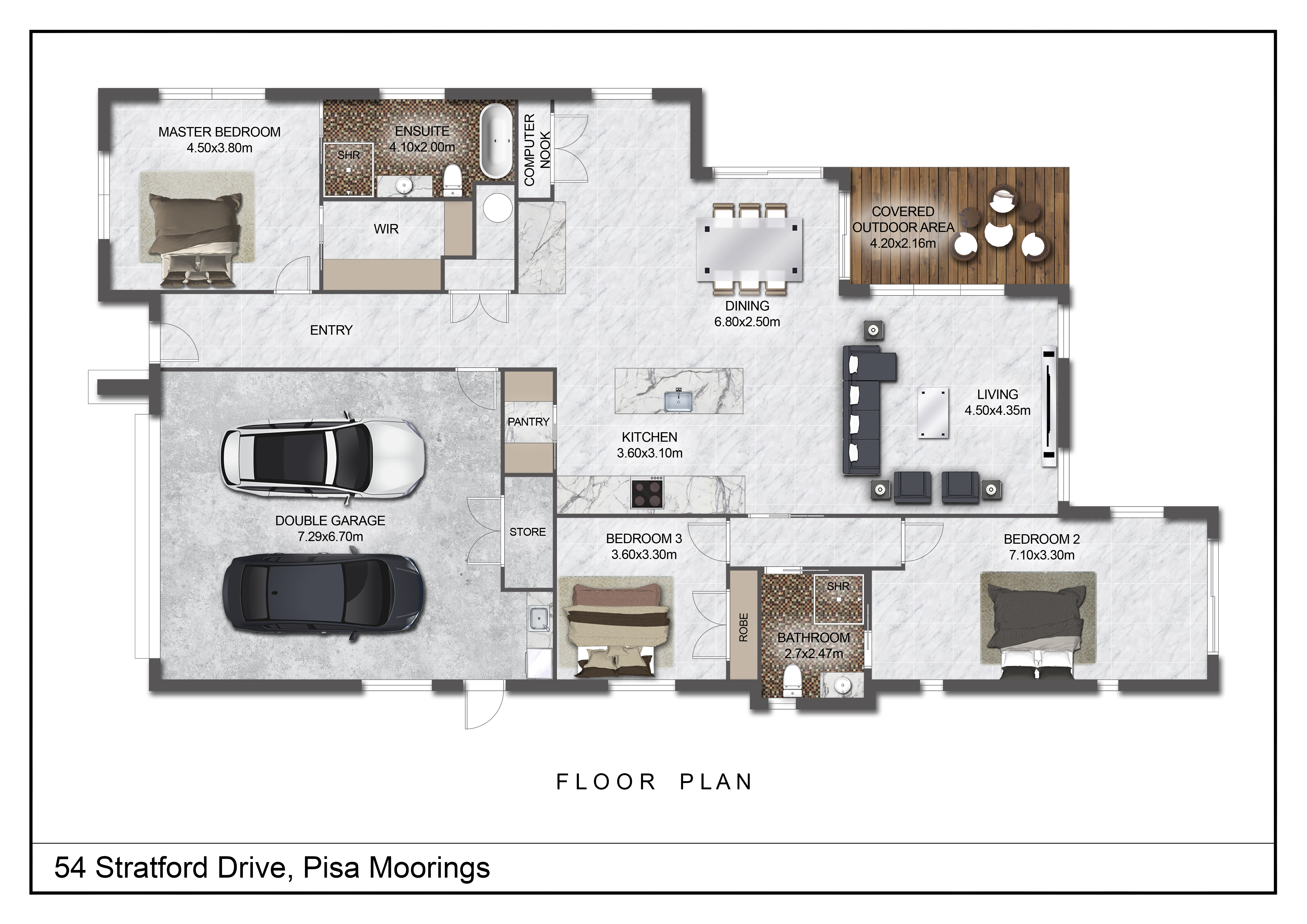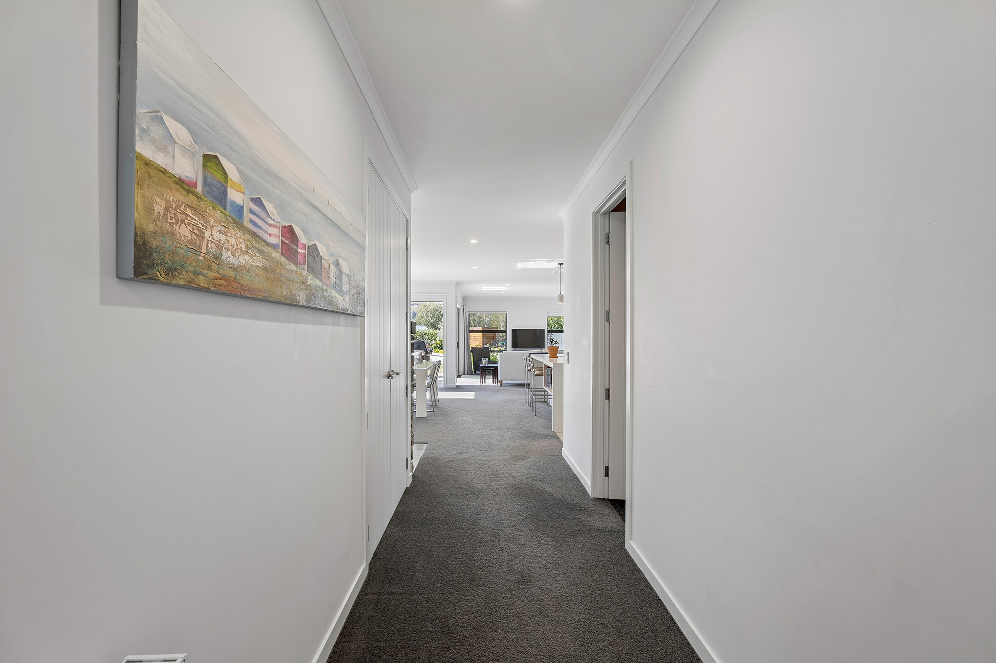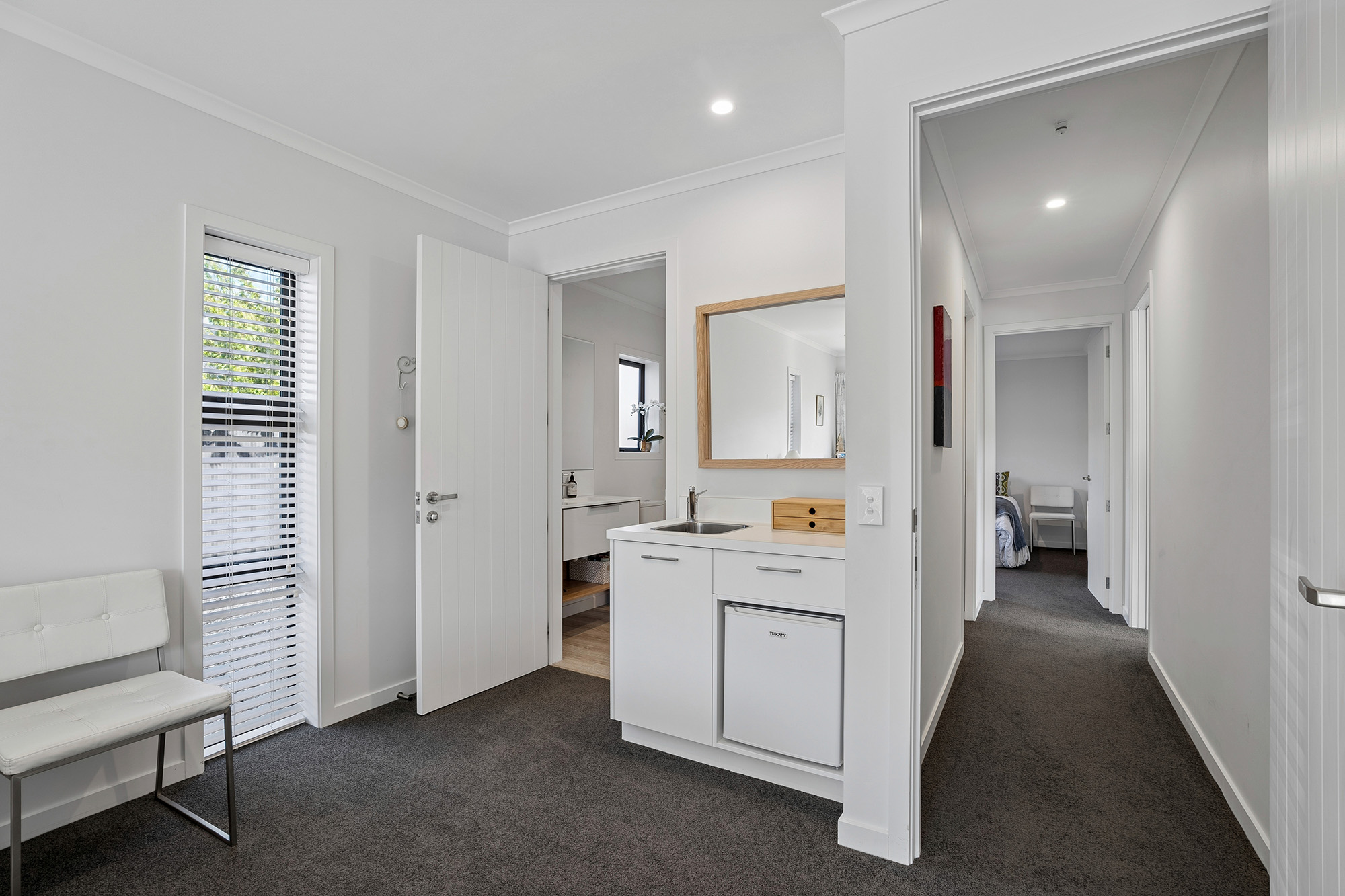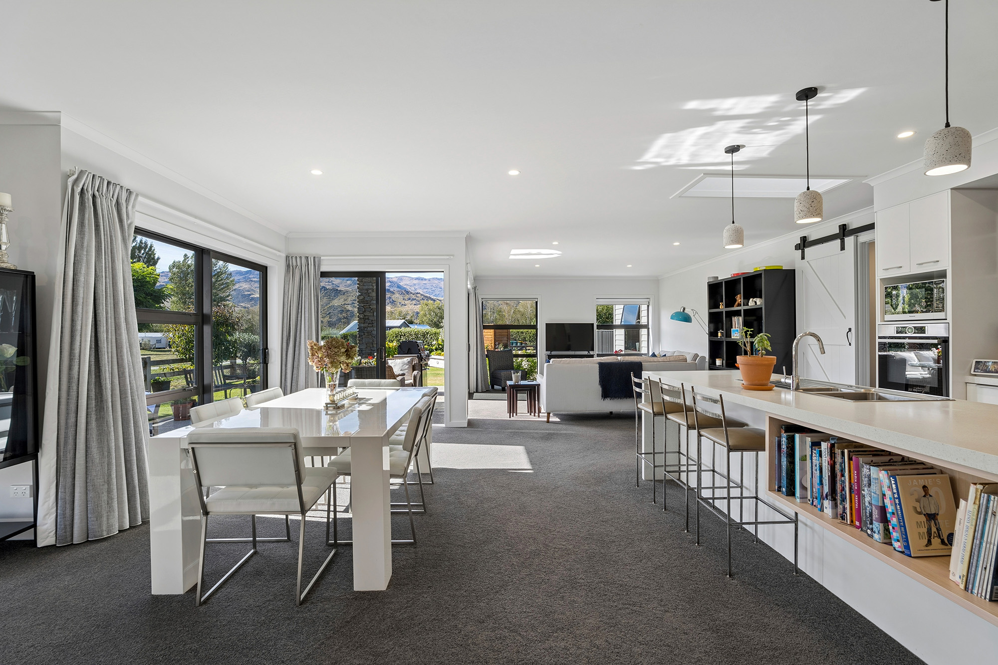 On entering the feeling of space encompasses you through the wide hall that leads to the stunning open plan living area. A combination of stacker and sliding doors to the covered outdoor entertainment area provides seamless indoor-outdoor flow with the central location of the kitchen enabling fabulous interaction when entertaining. The smart modern kitchen also features a large island bench, a well shelved walk-in pantry, skylights that also complement the contemporary designed look and feel of this home. An office nook is also carefully positioned in the living area hidden behind double doors. The master suite is separate to the two other bedrooms and is a welcomed space to retreat to, with the ensuite including the luxury of a bath and separate shower plus all the other extras. At the other end of this home are two bedrooms plus supporting bathroom. The third bedroom is very generous in size and is setup for guests with a tea, coffee and fridge area along with a separate entrance.