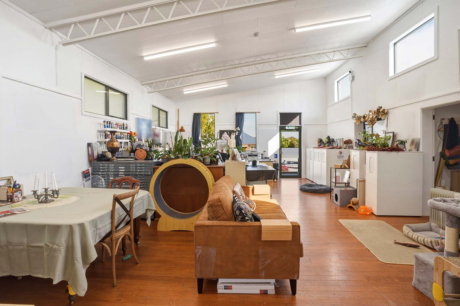 Inside, you'll find a well-appointed kitchen, a main bathroom, separate toilet facilities, a dedicated office, a generous open workspace, and ample storage. Comfort and efficiency have been prioritised, with double glazing throughout and a gas califont ensuring reliable hot water. Accessibility has also been well considered, with wheelchair access allowing ease of entry for all. Surrounding the building, established planting and thriving vegetable gardens create a peaceful, productive setting that enhances both the aesthetic and practical appeal of the site.