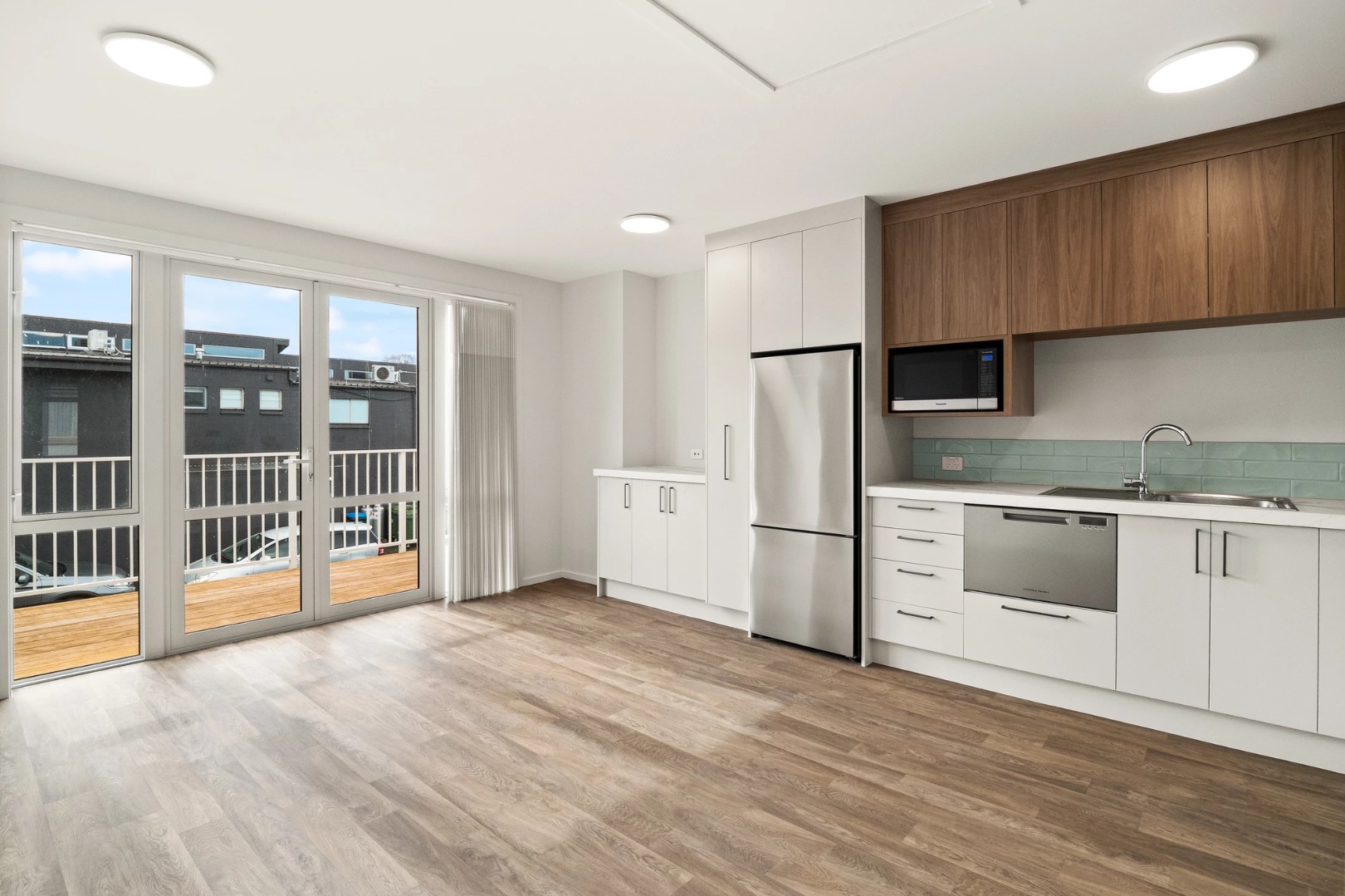 Single-level layout with open-plan living, dining, and kitchen flowing to the sunny deck.