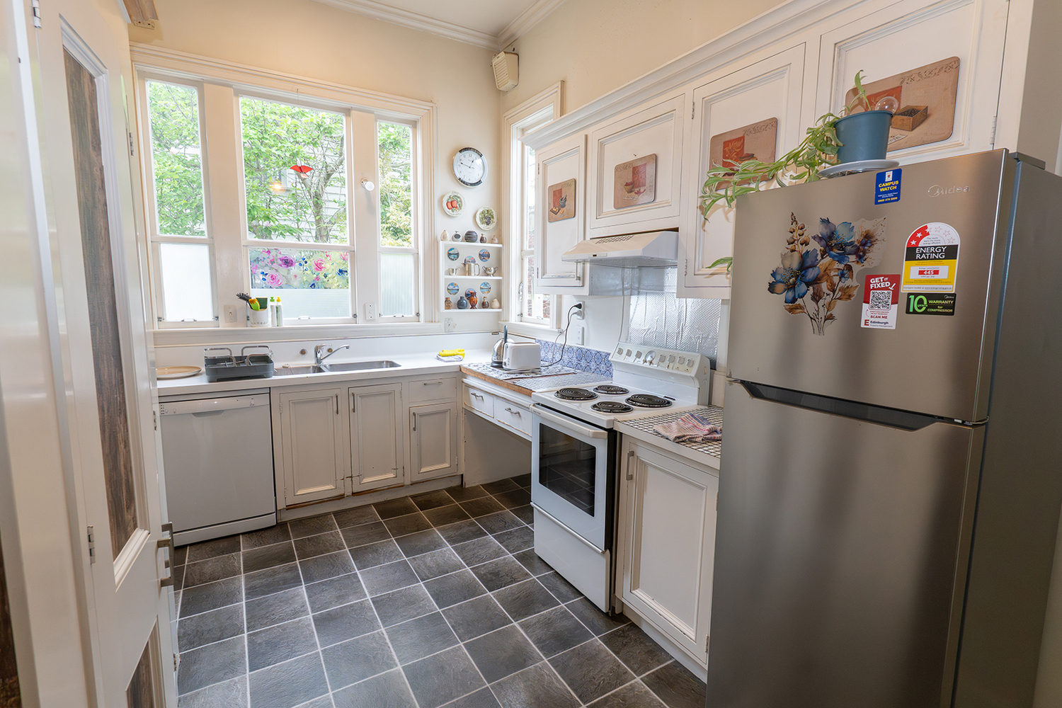 Communal kitchen and laundry including a dishwasher, washing machine and dryer.