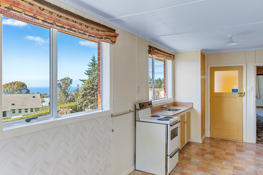 The living room provides a comfortable space, being heated by the Metro wood burner, with the spacious kitchen/dining area offering plenty of cupboard space and featuring outstanding expansive views over Dunedin and beyond.