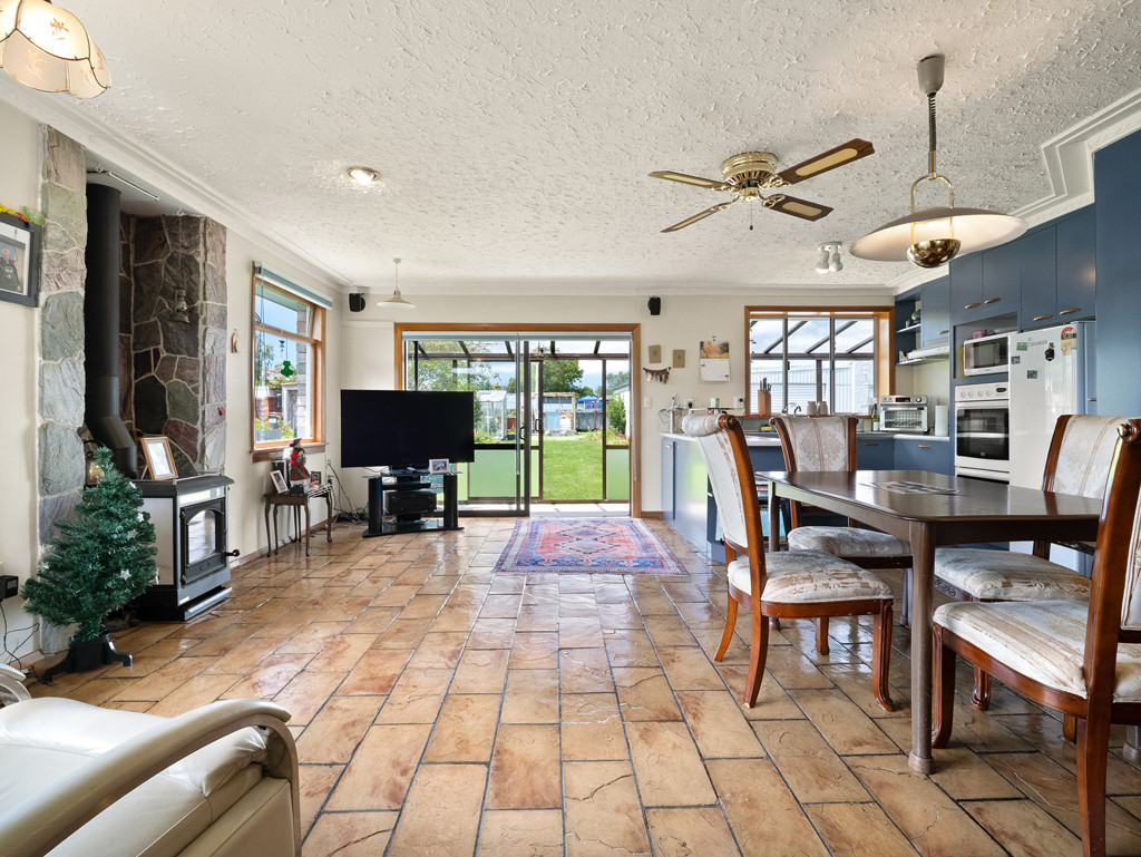 The spacious living area is open plan and includes the main lounge and dining all heated by the wood burner, with the updated modern kitchen featuring a two-door wall oven, cook top, range hood and waste disposal. Double doors lead through to the second living space.